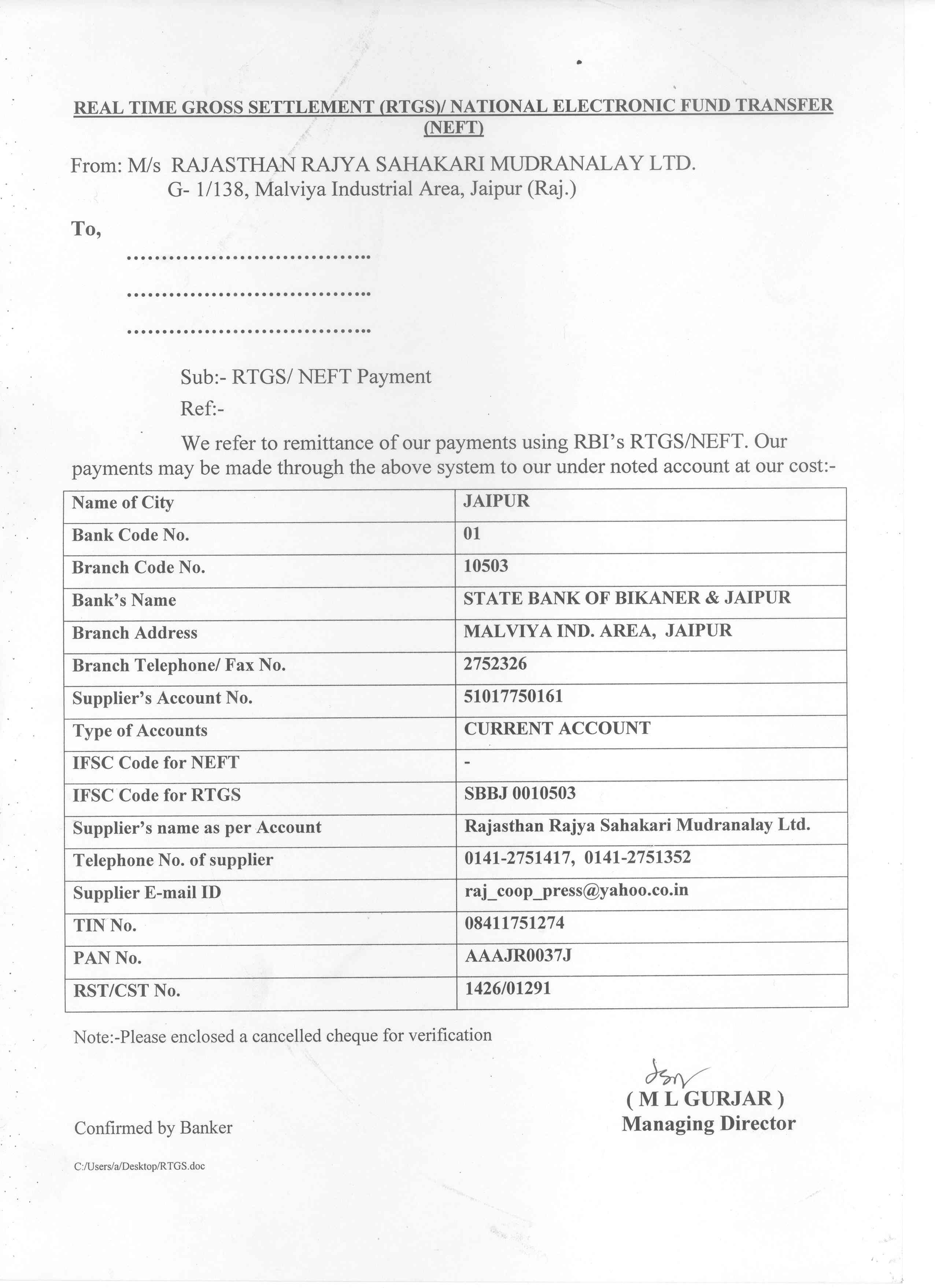 RTGS information for Online Payment